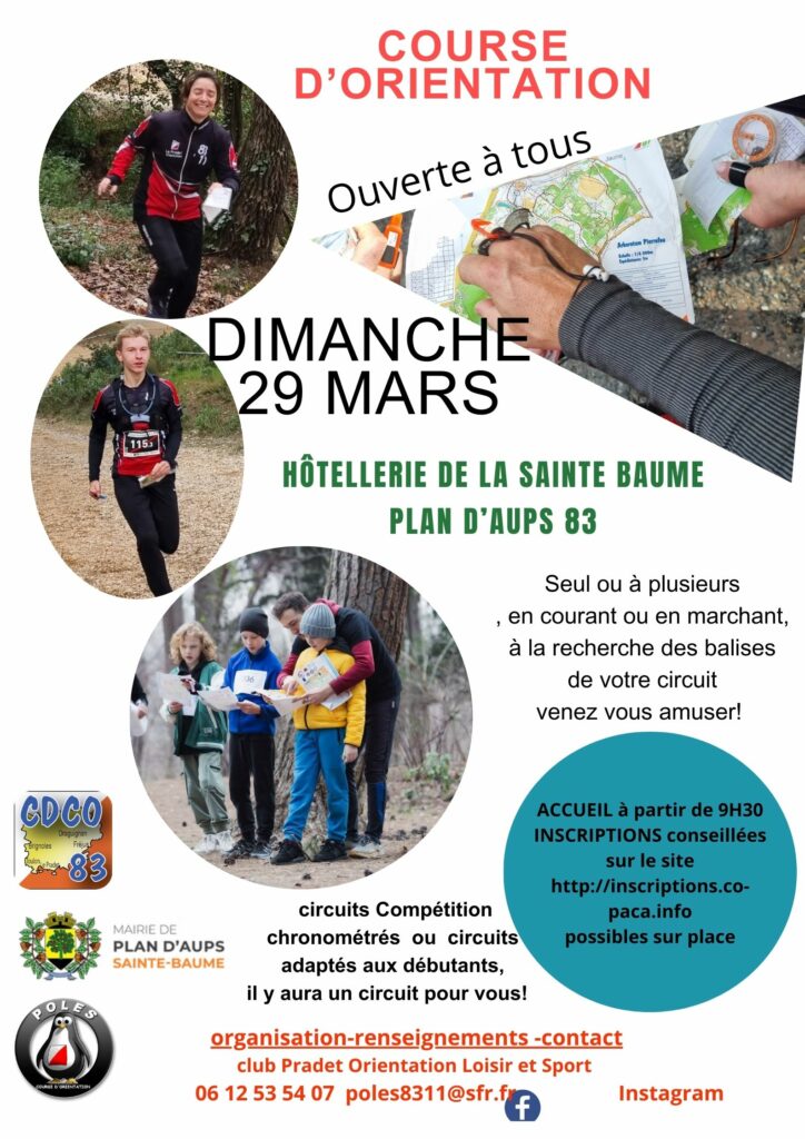 POLES a le plaisir de vous inviter à un week-end CO sur les beaux terrains de Mazaugues les 24 et 25 mai. Au programme : samedi 24, à partir de 13h30 : Challenge PACA O’VTT LD dimanche 25, 5° Challenge PACA de CO pédestre LD
